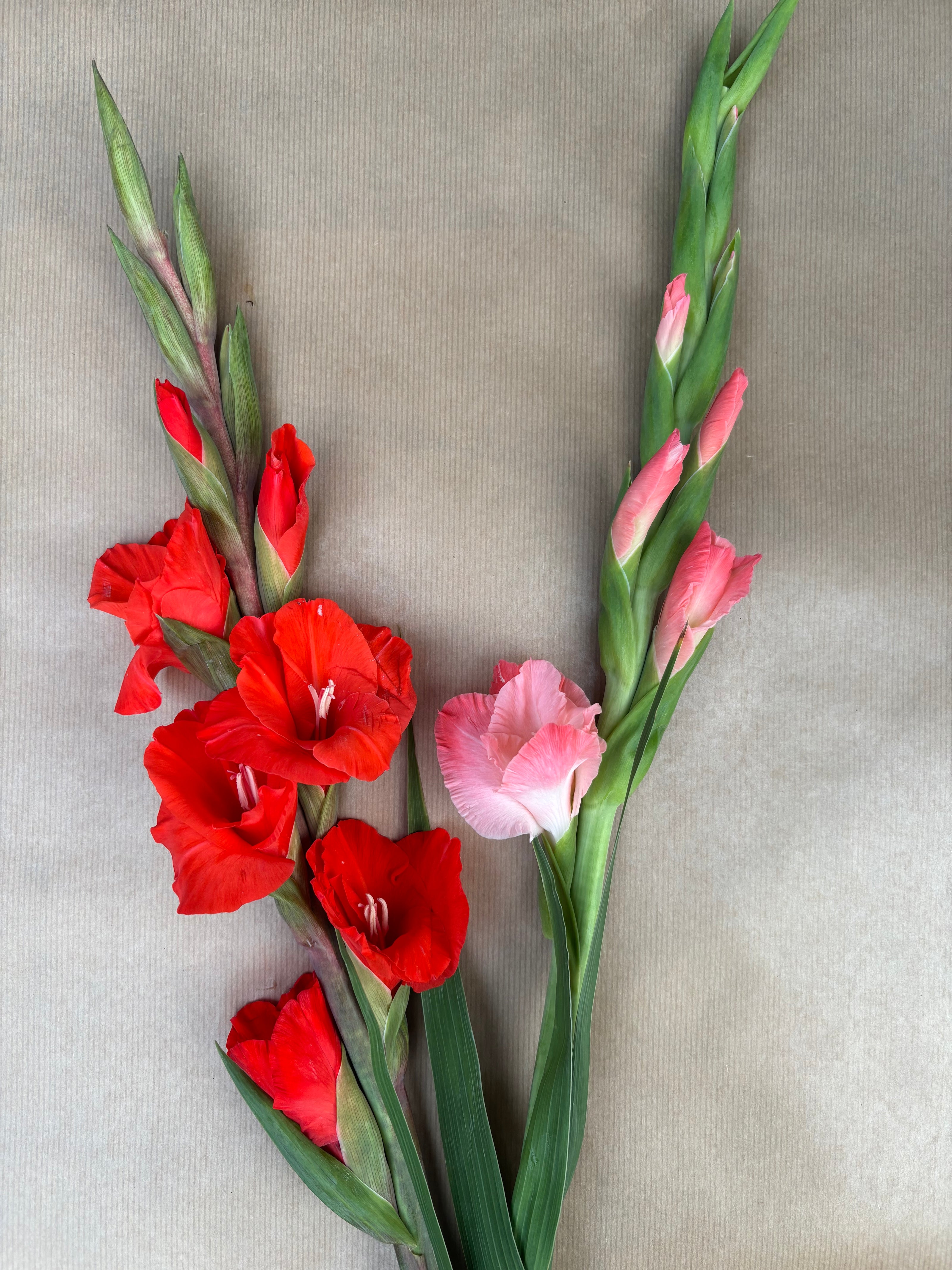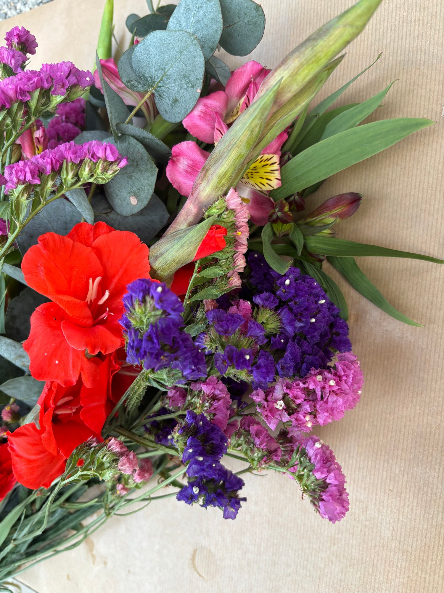 In this months box you will be enjoying all the colours , grown in Cornwall we have Cornish Statice , alstromeria , Gladioli and Eucalyptus.